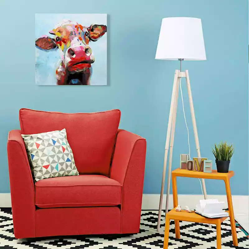 They say beauty is in the eye of the beholder. Art is too. Add a little character to any room in your home with our 24in. Colorful Cow embellished canvas wall art. The possibilities are endless with this brown, red, blue, orange, yellow, white and black multi wall decor. A whimsical curious brightly colored cow motif creates visual interest against a visually interesting backdrop. Hang this wall decor to make a bold statement and to add a touch of personality to your home decor.