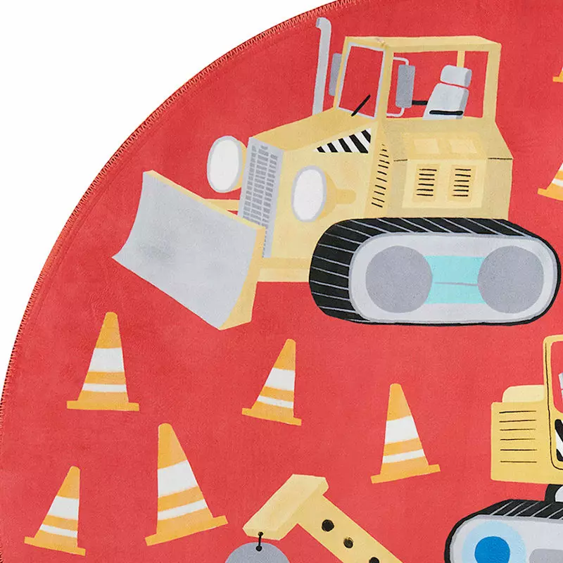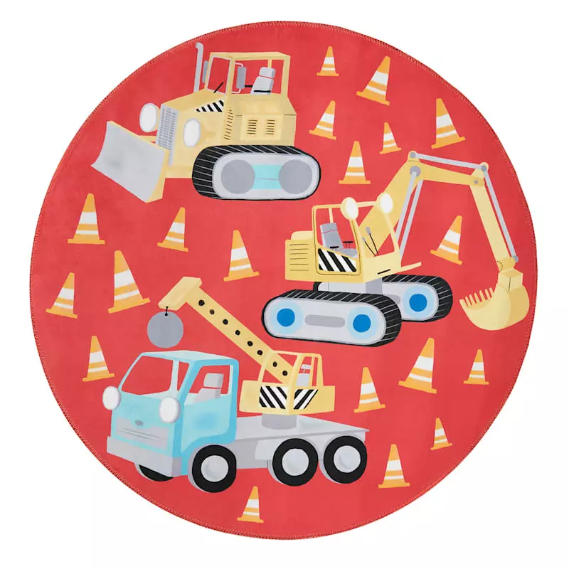 Our red Parker construction zone round accent rug will boost your child’s imagination with its whimsical truck, tractor and cone print. This 3ft. circular area rug is made from polyester with a durable design that’s stain-resistant and non-pilling, so it can stand up to everything your little one brings. The primary color palette of this kids’ rug features a fun motif ready for an abundance of everyday play.