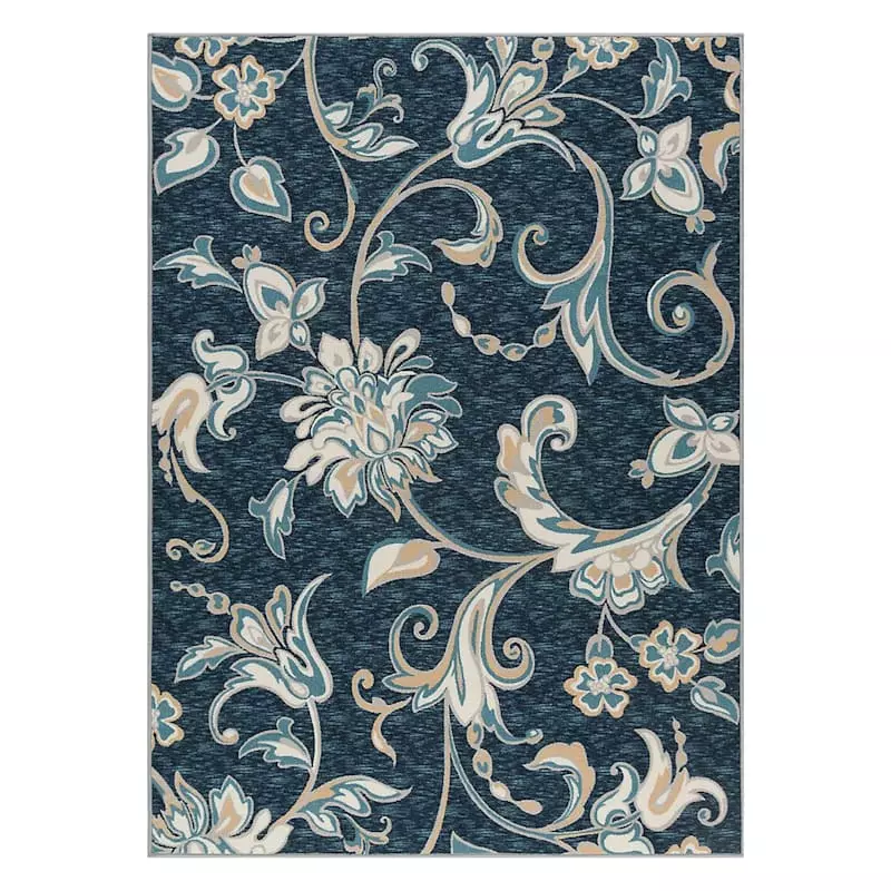 Our traditional ornamental floral design area rug blends a distinct leafy, floral scroll pattern with a deep navy blue backdrop for a fabulous foundation. This swirling beauty is made of a 100% nylon fiber that’s easy to clean. It’ll withstand year-round use, making it the perfect choice for easy living and easy maintenance. Available in 2x4ft., 5x7ft. and 7x10ft. sizes.