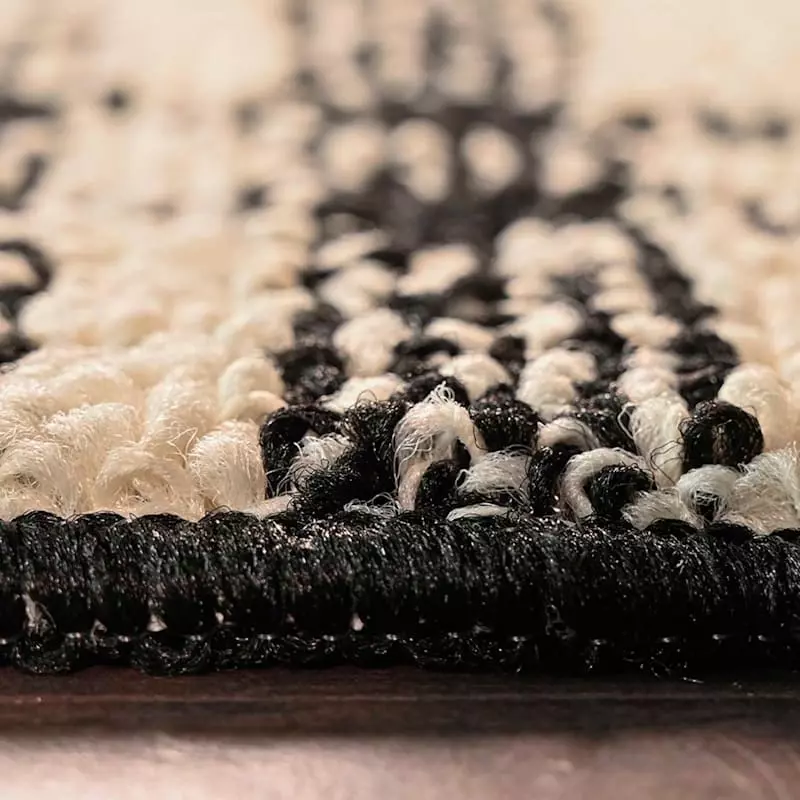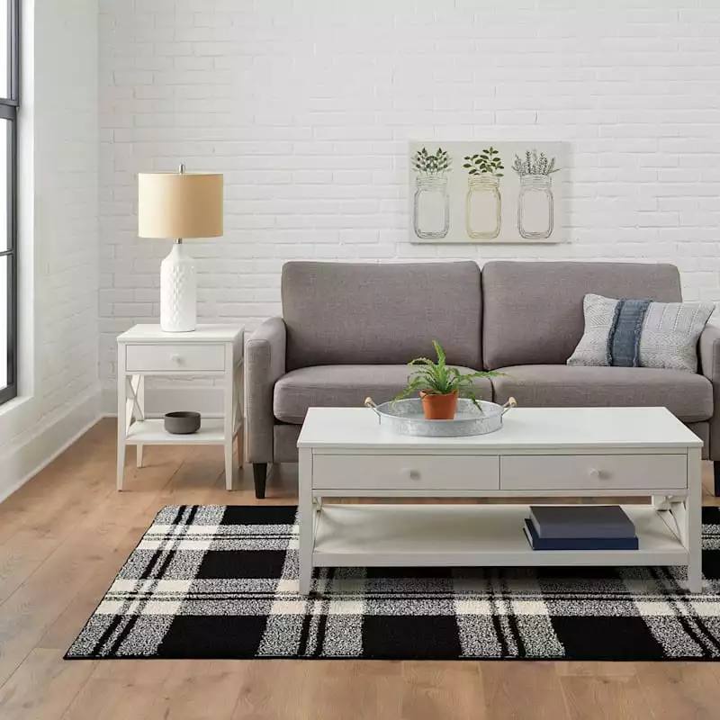 Modern farmhouse meets At Home prices in Honeybloom, our exclusive new brand that celebrates life lived together. Use this black and ivory rug in any part of your home. Whether it’s in the kitchen, family room or entryway, this charming buffalo check area rug has wonderful texture and easy-care polyester material for comfortable steps and long-lasting use. Available in 5x7ft. and 7x9ft. sizes.