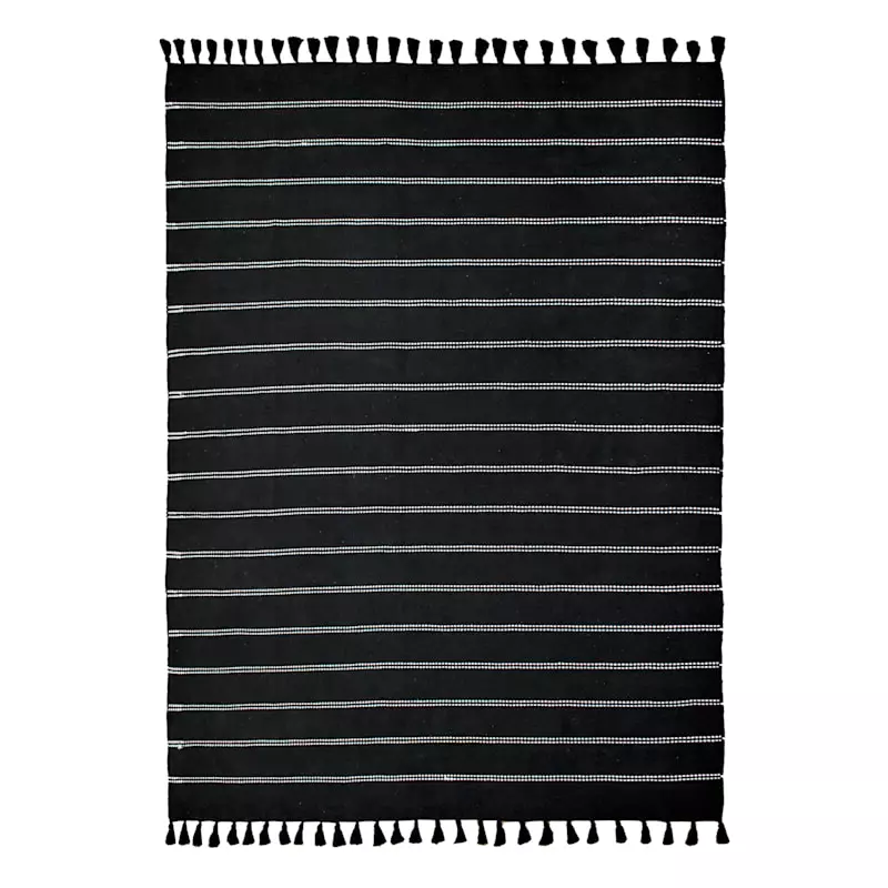 Modern farmhouse meets At Home prices in Honeybloom, our exclusive new brand that celebrates life lived together. All artistic aspects aside, area rugs help absorb and decrease the noise factor as they soften the step on any hard flooring within your home. Take our flatweave black striped woven area rug, for example. Designed with a solid natural and neutral colorway, this area rug brings an element of organic simplicity to your space. Perfectly at home in casual to formal situations, this 100% cotton rug is a natural go-to for eclectic living rooms, bedrooms and so much more. Available in 2x4ft., 5x7ft. and 8x10ft. sizes and a 2x7ft. runner.