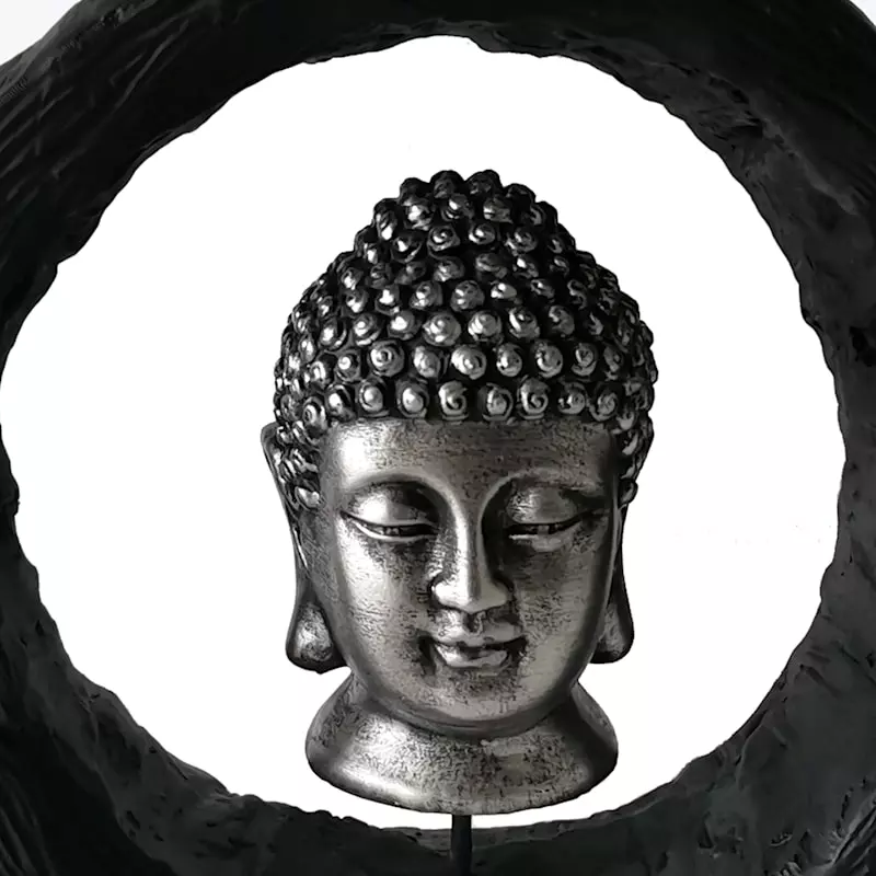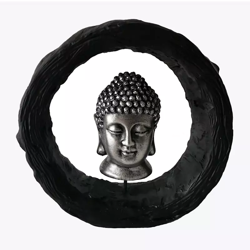 Found & Fable is a new collection that lets you explore what’s right around the corner. Choose your own adventure every day. Savor it all and say yes to what comes next—exclusively At Home. Round out your indoor or outdoor decor’s visual appeal with this 9.5in. Buddha head in circle figurine table decor, crafted of resin and showcasing a brilliant silver and black finish. This piece’s architectural details add a pop to your look, while the design’s simple color blends effortlessly into any color palette. Set this piece inside and it’ll round out your space with wonderful coordinating seasonal decor.