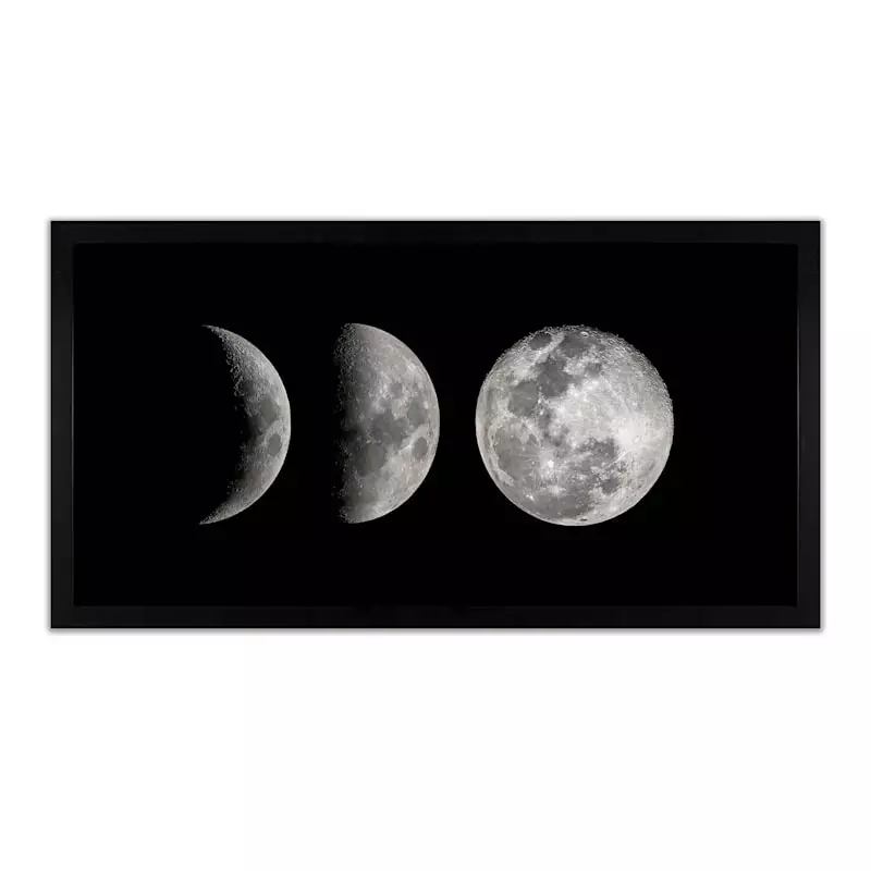 Moon phase decor is always stylish! This minimalist framed art shows three moon phases: full, half, and crescent. This beautiful black and white art can make any space a little dreamier. The print is fully framed and comes with protective glass. Hang this conversation piece to see which friends and family know the names of the moon phases. Finally, your inner lunar goddess can enjoy night sky-inspired modern framed art, making your space more perfect than ever!