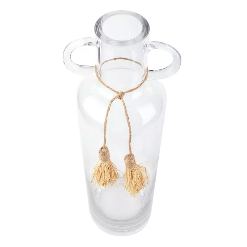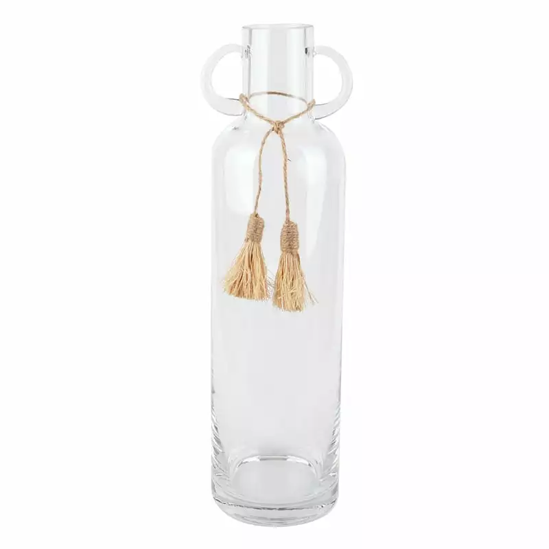Modern farmhouse meets At Home prices in Honeybloom, our exclusive new brand that celebrates life lived together. Our 18in. Clear glass vase with tassels is a great little addition to your modern home and great for transporting with its handles. This vase is perfect to place you favorite flowers and watch them bloom, or leave it as is. Great to have for many years to come.