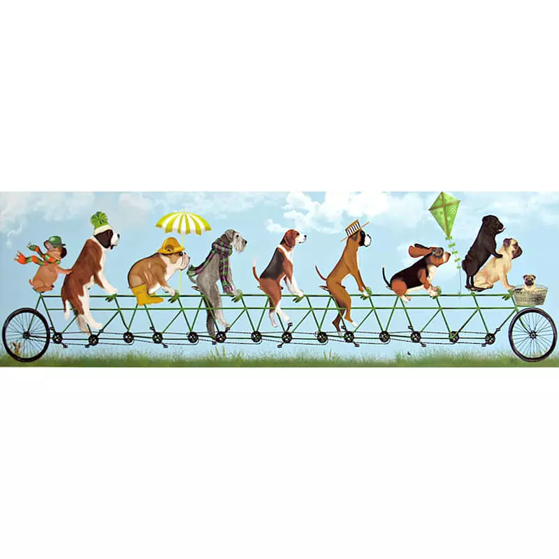 They say beauty is in the eye of the beholder. Art is too. Add a little character to any room in your home with our 32x10in. Mutley Crew on Tandem canvas wall art. The possibilities are endless with this blue, green, yellow red, orange, pink gold and tan multi wall decor. A multicolor dog on extended tandem bicycle motif creates visual interest against a visually interesting backdrop. Hang this wall decor to make a bold statement and to add a touch of personality to your home decor.
